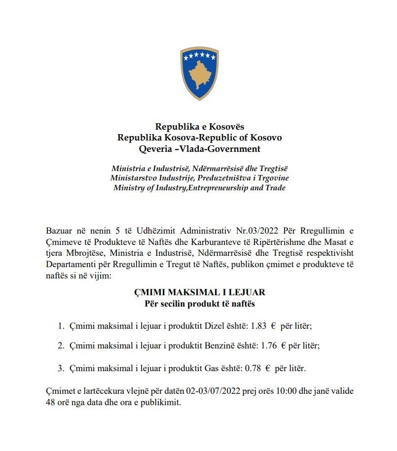 Ministria e Industrisë, Ndërmarrësisë dhe Tregtisë ka publikuar limitin për çmimet e karburanteve për 48 orët e ardhshme në Republikën e Kosovës.