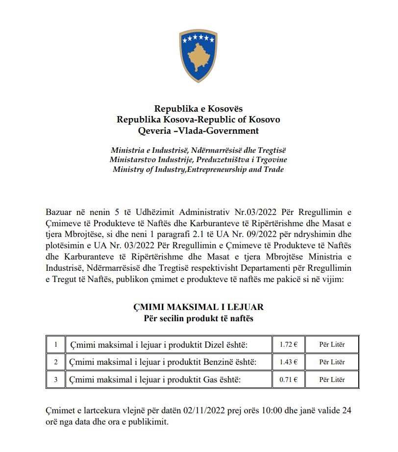 Sipas vendimit të MINT, çmimi maksimal i lejuar për shitjen e naftës është 1 euro e 72 centë, i benzinës 1 euro e 43, duke shënuar ngritje për një cent nga dita e djeshme, derisa i gazit 71 centë.