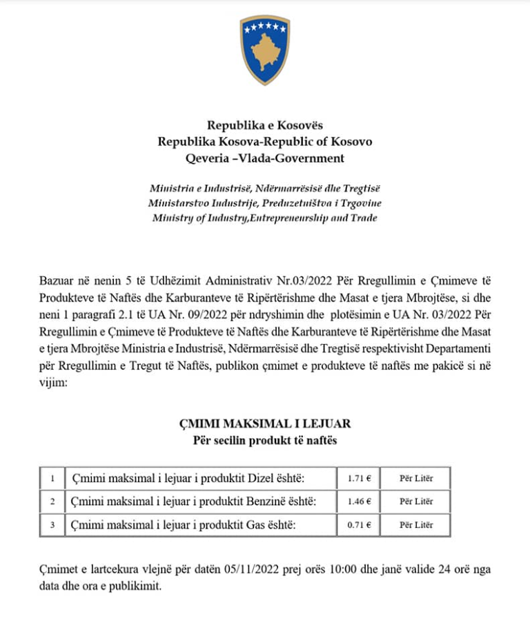 Çmimi maksimal i lejuar për shitjen e naftës është 1.71 euro, benzina 1.46 euro , derisa gasi 0. 71 centë.