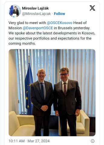 “Shumë i lumtur ta prisja Shefin e OSBE-së, Daveportin në Bruksel gjatë ditës së djeshme. Folëm për zhvillimet e fundit në Kosovë, portofolet tona përkatëse dhe pritshmëritë tona për muajt në vijim”, ka shkruar Lajçak në platformën “X”.