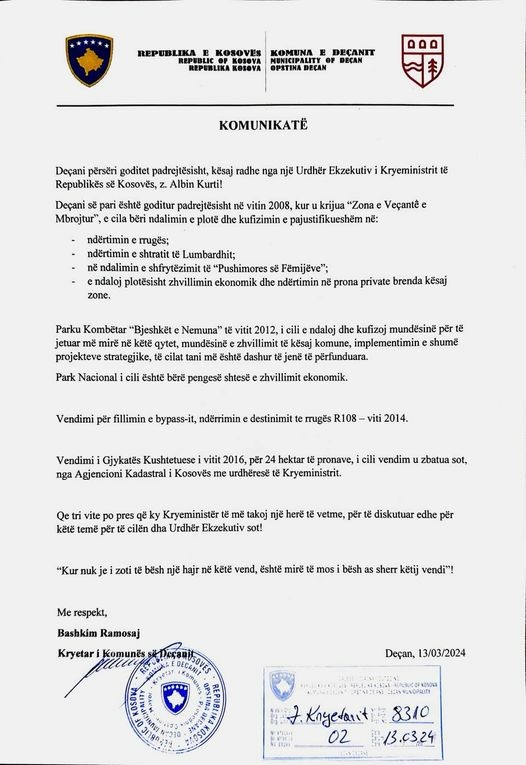 “Deçani përsëri goditet padrejtësisht, kësaj radhe nga një urdhër ekzekutiv i kryeministrit të Republikës së Kosovës, z. Albin Kurti! Deçani së pari është goditur padrejtësisht në vitin 2008, kur u krijua ‘Zona e Veçantë e Mbrojtur’, e cila bëri ndalimin e plotë dhe kufizimin e pajustifikueshëm në: ndërtimin e rrugës; ndërtimin e shtratit të lumëbardhit; në ndalimin e shfrytëzimit të ‘Pushimores së Fëmijëve’; e ndaloj plotësisht zhvillimin ekonomik dhe ndërtimin në prona private brenda kësaj zone”, shkroi ai.