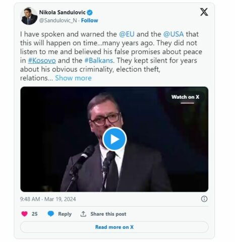 Politikani serb, Nikola Sanduloviq ka reaguar ndaj deklaratave kërcënuese të presidentit serb, Aleksandar Vuçiq. Ai në një reagim në “X” ka shkruar se kishte paralajmëruar më parë BE-në dhe SHBA-në se kjo do të ndodhte.