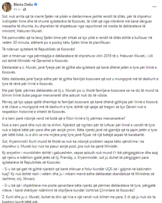 Deputetja e PDK-së, Blerta Deliu-Kodra në pamundësi për të marrë fjalën më gjatë në foltoren e Kuvendit të Kosovës, përmes një shkrimi në Facebook, ka thënë se është e tmerruar nga fyerjet e Minisrit të Financave, Hekuran Murati ndaj UÇK-së.