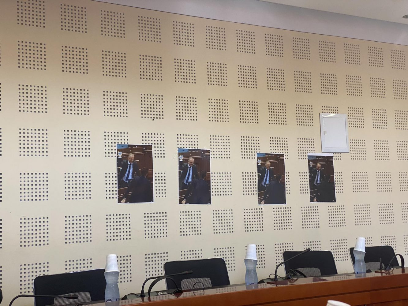 Deputetja e Partisë Demokratike të Kosovës, Blerta Deliu-Kodra, ka vendosur disa posterë në Komisionin për Integrim Evropian ku shihet zëvendëskryeministri Besnik Bislimi duke e gjuajtur me shishe deputetin e PDK-së, Mërgim Lushtakun.