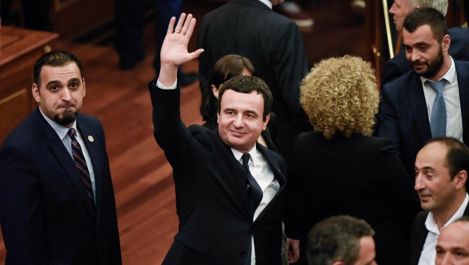 Newly elected Prime Minister of Kosovo Albin Kurti (C) waves after the voting session of the Assembly in Pristina on February 3, 2020. - Albin Kurti was voted on February 3 Kosovo's new prime minister, raising hopes that a EU-mediated dialogue with Serbia, in stalemate for over a year, could resume and ease tensions in the war-scarred region. The 44-year old Kurti and his cabinet were elected four months after a snap election and only a day before the deadline, avoiding to push Kosovo into a political crisis. Once dubbed 'Kosovo's Che Guevara', Kurti vowed to tackle economy and unemployment, fight corruption and introduce a three-month compulsory military service. (Photo by Armend NIMANI / AFP)