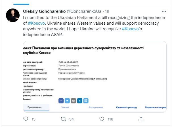 “Kam dorëzuar në Parlamentin e Ukrainës një rezolutë për njohjen e pavarësisë së Kosovës. Ukraina ndan vlerat perëndimore dhe do të mbështesë demokracinë kudo në botë. Shpresoj se Ukraina do ta njohë pavarësinë e Kosovës sa më shpejt që të jetë e mundur”, ka shkruar Goncharenko në Twitter./arbresh.info/