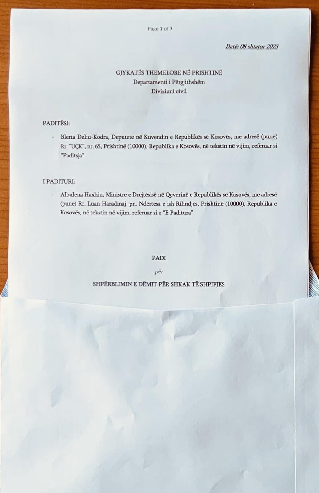 Deputetja e Partisë Demokratike të Kosovës (PDK), Blerta Deliu-Kodra, ka dorëzuar padi për shpifje kundër ministres së Drejtësisë, Albulena Haxhiu.