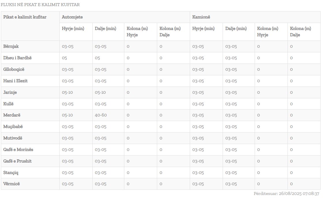 Qendra Kombëtare për Menaxhimin Kufitar ka përditësuar të dhënat lidhur me gjendjen aktuale në pikat kufitare.