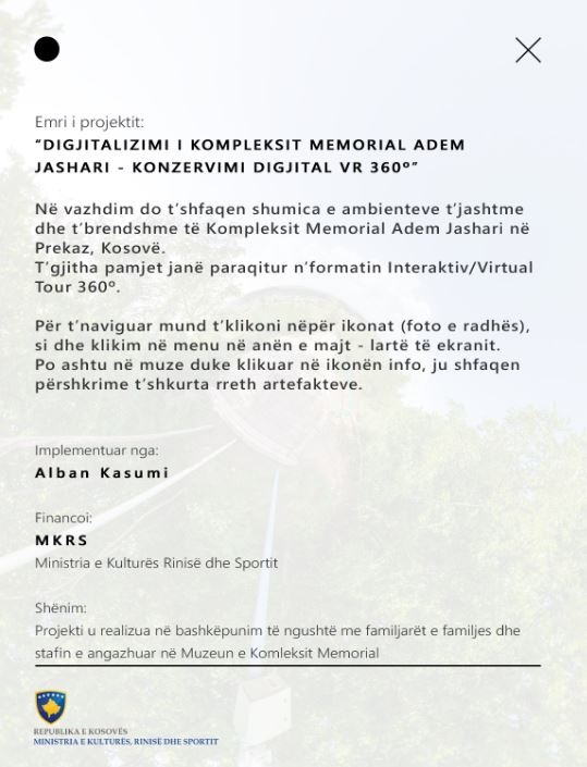 Projekti “Digjitalizimi i Kompleksit Memorial Adem Jashari – Konzervimi Digjital VR 360”, i shfaq ambientet e jashtme dhe të brendshme të kompleksit. /arbresh.info/