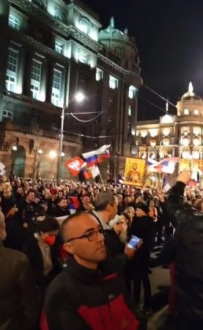 Serbët me flamuj të Rusisë dhe me disa parulla ‘Albright digju në ferr’ dolën për të festuar në rrugët e kryeqytetit serb.