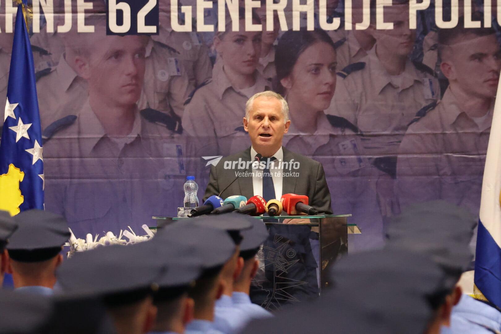 “Për 26 vjet me radhë Policia e Kosovës shërben me dinjitet dhe po forcohet çdo ditë e më shumë. Të jesh pjesë e Policisë së Kosovës është nder dhe krenari e lartë. 280 kadetë i bashkon misioni dhe qëllimet e njëjta. Ju jeni këtu për ta lartësuar uniformën tonë. Kemi investuar në pasje policore kemi rregulluar stacione të policisë. Nga sot nga momenti i betimit ju do ti shërbeni ligjit” , tha Bislimi./Arbresh.info/