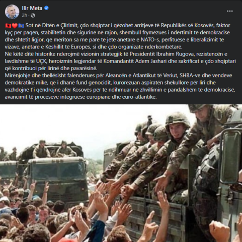 Presidenti i Republikës së Shqipërisë, Ilir Meta, ka përkujtuar ditën e çlirimit të Kosovës.