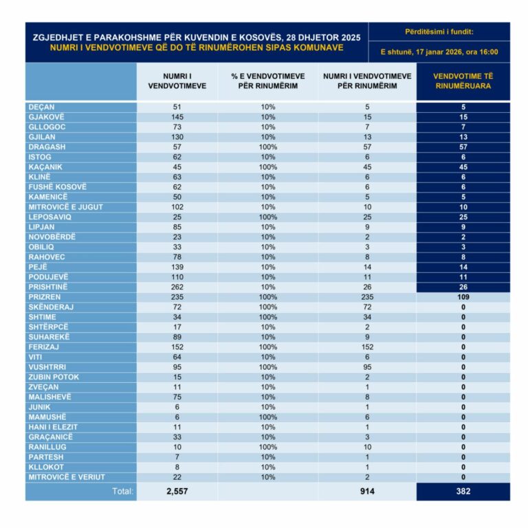 Nga fillimi i këtij procesi (e martë, 13 janar 2026, ora 18:00) dhe deri më tani (e shtunë, 17 janar 2026, ora 16:00) janë rinumëruar 382 nga 914 vendvotime, të cilat u takojnë komunave: Deçan (5/5), Gjakovë (15/15), Gllogoc (7/7), Gjilan (13/13), Dragash (57/57), Istog (6/6), Kaçanik (45/45), Klinë (6/6), Fushë Kosovë (6/6), Kamenicë (5/5), Mitrovicë e Jugut (10/10), Leposaviq (25/25), Lipjan (9/9), Novobërdë (2/2), Obiliq (3/3), Rahovec (8/8), Pejë (14/14), Podujevë (11), Prishtinë (26/26) dhe Prizren (109/235).