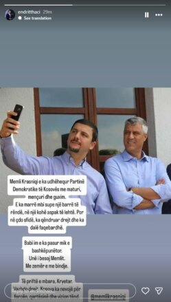 Sipër një fotoje të Memli Krasniqit me ish-Presidentin Hashim Thaçi, Endriti ka shkruar se kryetari aktual i PDK-së, Memli Krasniqi, e ka marrë mbi supe një barrë të rëndë, në një kohë aspak të lehtë, por sipas tij, në çdo sfidë, ka qëndruar drejt dhe ka dalë faqebardhë”, ka shkruar Thaçi.