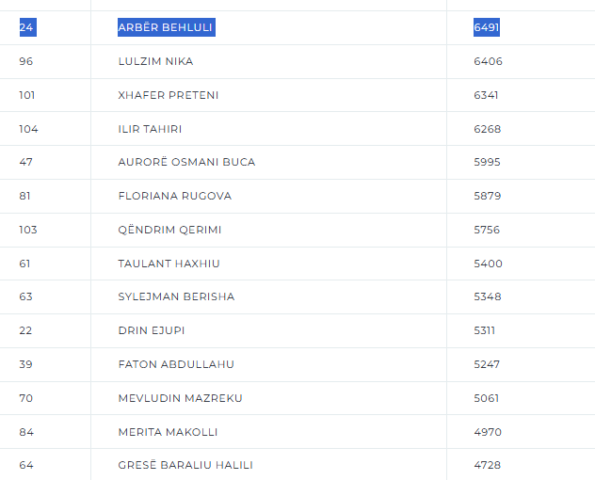 Behluli i cili kishte numrin 24 në listën e PDK-së, nga numërimi i mbi 94 përqind të votave, arriti deri më tani t’i marrë vetëm 6 mijë e 491 vota.