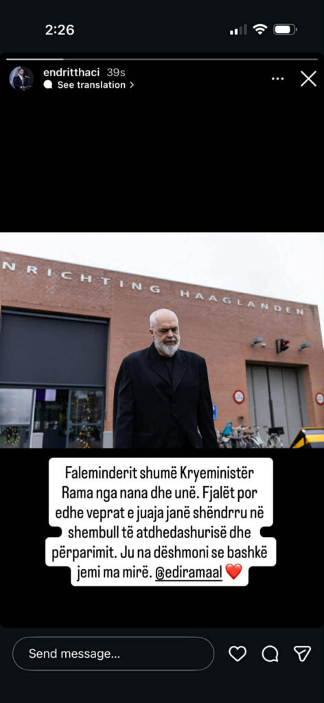 Në një postim në Instagram, Endrit e falënderoi kryeministrin Rama, dhe tha se veprat e tij ” janë shëndrru në shembull të atdhedashurisë dhe përparimit.”