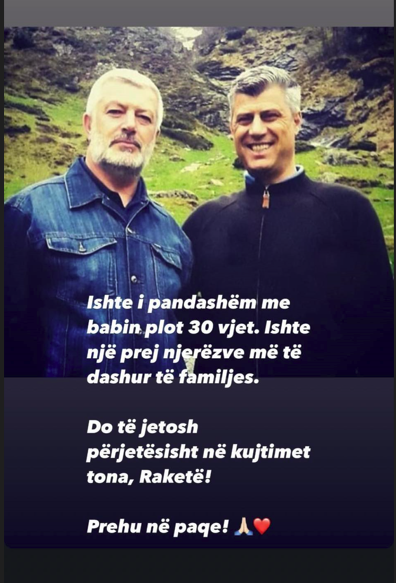 “Do të jetosh përjetësisht në kujtimet tona, Raketë! Prehu në paqe”, shkruan djali i ish presidentit Thaçi./Arbresh.info/