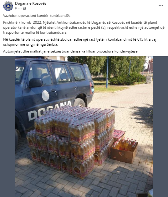 Në kuadër të planit operativ është zbuluar edhe një rast tjetër i kontabandimit të 615 litra vaj ushqimor me origjinë nga Serbia, ka njoftuar Dogana e Kosovës.