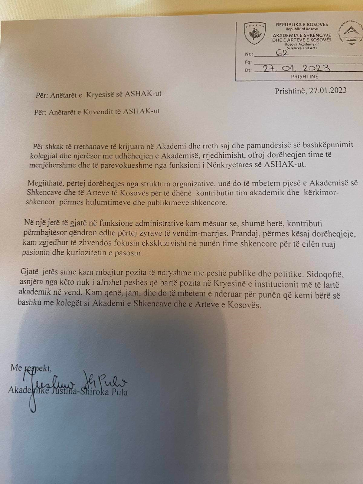 Justina Shiroka-Pula ka dhënë të premten dorëheqje nga pozita e saj si nënkryetare e Akademisë së Shkencave dhe Arteve të Kosovës .