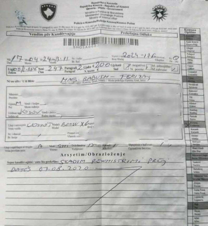 “Policia e Komunikacionit Rrugor në Ferizaj me datën 17.04.2024 rreth orës 13:11 në rrugën magjistrale Ferizaj-Prishtinës, saktësisht në fshatin Babush ka ndaluar shoferin B.S (M/K) i moshës 44 vjeçar, i cili po drejtonte veturën me afat të skaduar të regjistrimit që nga data 07.08.2020.Ndaj tij policia i ka shqiptuar një gjobë kundërvajtëse prej dyqind (200) euro dhe ia konfiskoi veturën”, thuhet në njoftimin e policisë.