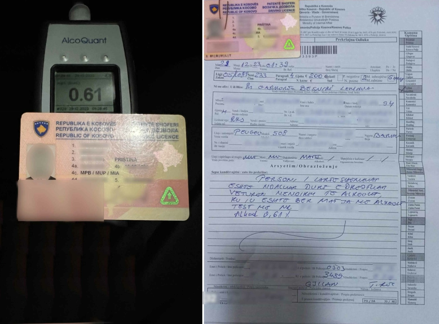 “Njësiti rajonal i trafikut rrugor Gjilan gjatë kontrollit në trafik kanë ndalur për kontroll një automjet me vozitës mashkull, kosovar serb. Gjatë kontrollit është dyshuar se vozitësi i mjetit mund të jetë nën ndikim të alkoolit dhe të njëjtit pasi që i është bërë matja e alkoolit me alkool test ka rezultuar se ka qenë nën ndikim të alkoolit me 0.61 promilë.Zyrtarët policor ndaj këtij kundërvajtësi kanë shqiptuar gjobën në vlerë prej dyqind (200) euro, dy (2) pikë negative dhe masën mbrojtëse të heqjes së drejtimit të mjeteve motorike në afat prej gjashtë (6) muaj’, thuhet në njoftim./Arbresh.info