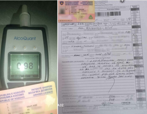 “Njësiti rajonal i trafikut rrugor Gjilan gjatë kontrollit në trafik kanë ndalur për kontrolle një automjet me vozitës mashkull, kosovar serb. Gjatë kontrollit kanë dyshuar se vozitësi mund të jetë nën ndikim të alkoolit dhe të njëjtit pasi që i është bërë matja e alkoolit me alkool test ka rezultuar se ka qenë nën ndikim të alkoolit me 0.98 promilë.”