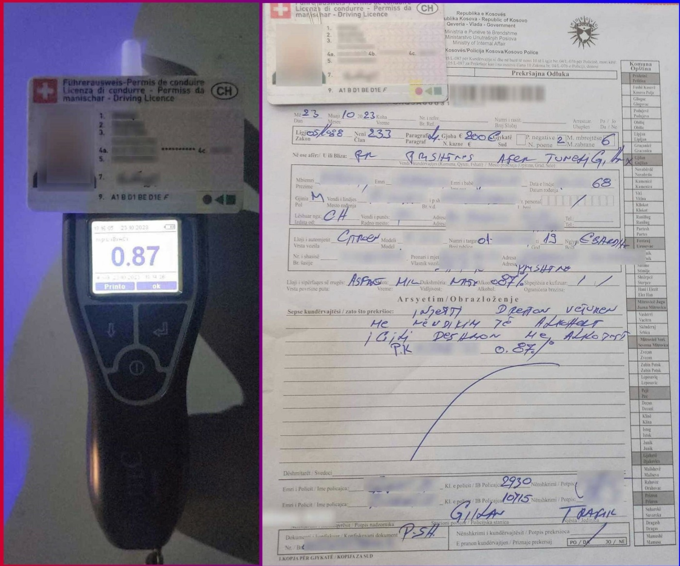 Sipas njoftimit, të njëjtit pasi që i është bërë matja e alkoolit me alkool test ka rezultuar se ka qenë nën ndikim të alkoolit me 0.87 promilë.