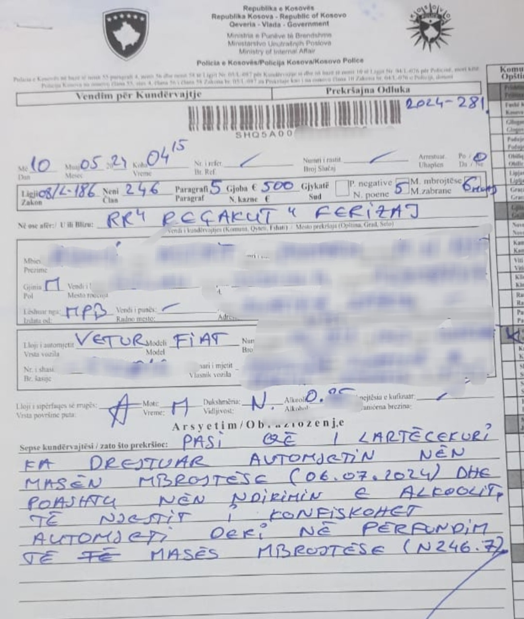 Në njoftimin për media bëhet e ditur se Policia e stacionit në Ferizaj më 10.05.2024 rreth orës 04:15 në rrugën “Reçaku ” në Ferizaj ka ndaluar shoferin A.A (M/K) i moshës 29 vjeçar, i cili ka drejtuar veturën nën ndikim të alkoolit, ku rezultoi 0.85 promila dhe nën masën mbrojtëse.