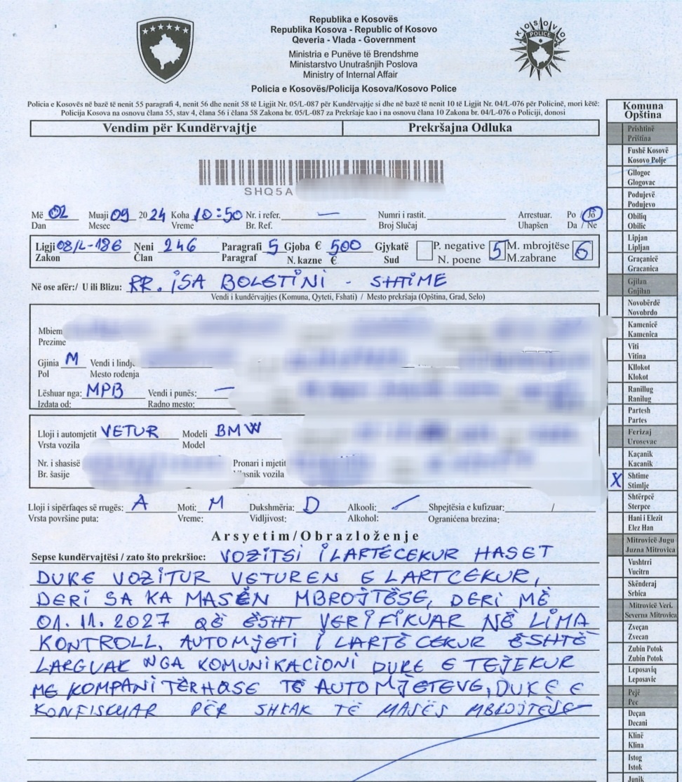 “Policët e stacionit në Shtime me datën 02.09.2024, rreth orës 10:50 në rrugën “Isa Boletini” në Shtime kanë ndaluar shoferin A.L (M/K) i moshës 23 vjeçar, i cili ka drejtuar veturën nën masën mbrojtëse, ku me ligjin e ri parashihet gjobë, vazhdim i masës mbrojtëse, pikë negative dhe konfiskim i automjetit.”, thuhet në njoftimin e policisë.