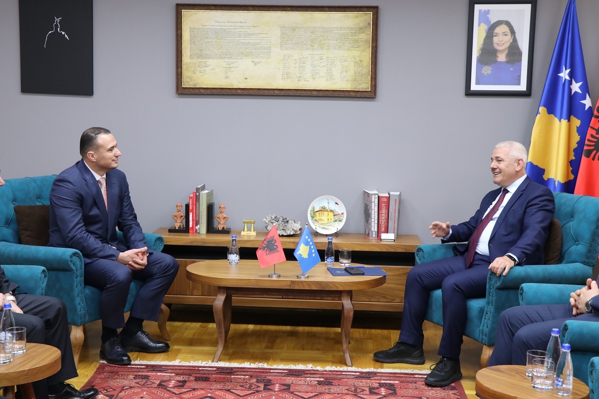 Ministri i Punëve të Brendshme Xhelal Sveçla i shoqëruar nga Drejtori i Përgjithshëm i Policisë së Kosovës Gazmend Hoxha dhe zëvëndësdrejtori Fehmi Hoti, priti sot në takim Drejtorin e ri të Policisë së Shqipërisë, Ilir Proda.