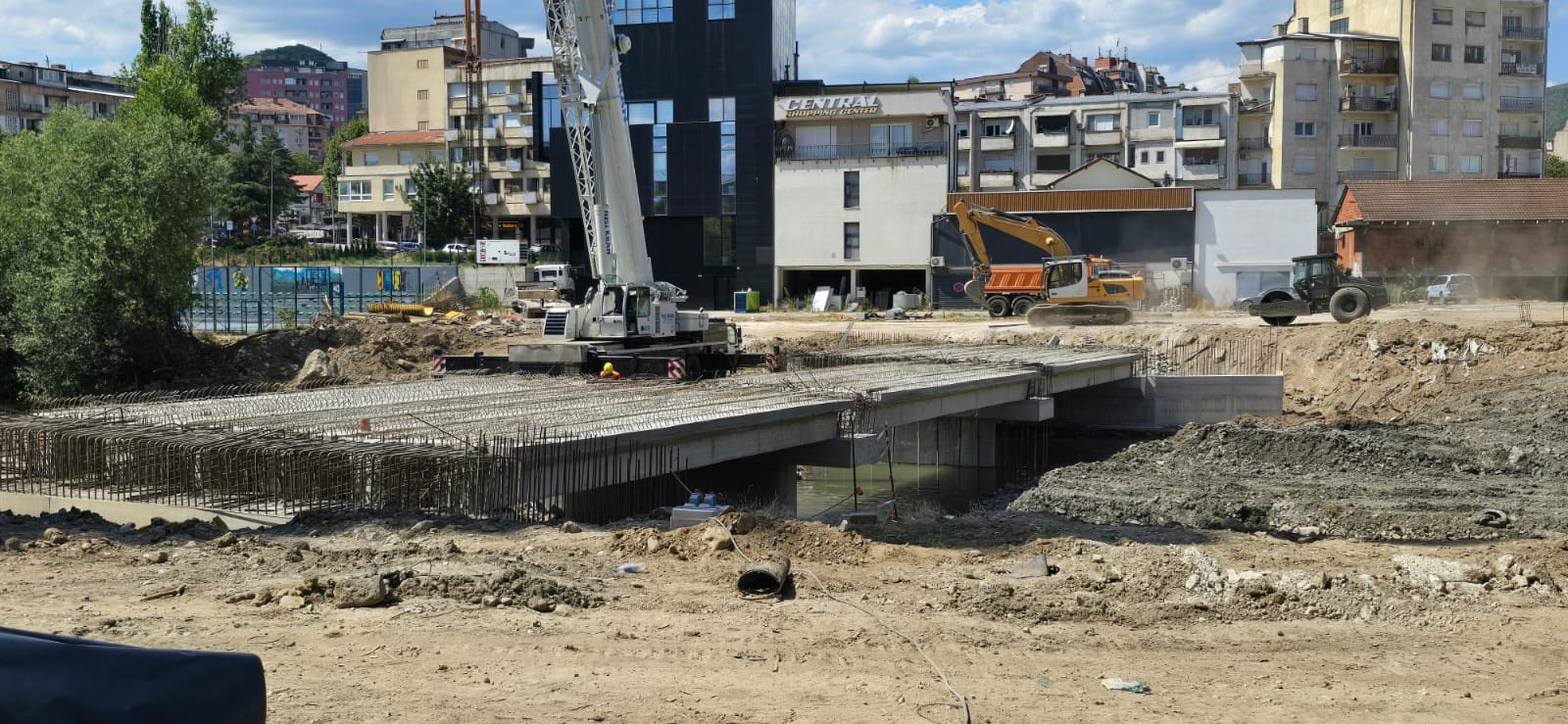 Një muaj e dy ditë prej kur filluam. U betonuan pilotat e betonit, u përgatitën, armuan e betonuan themelet e urës, u përgatitën, armuan e betonuan shtyllat e urës. Dje e sot u vendosën 18 trarë të cilët ishin përgatitur, armuar e betonuar në një punishte në Bair të Mitrovicës.