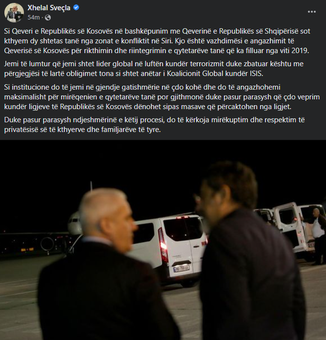 “Si Qeveri e Republikës së Kosovës në bashkëpunim me Qeverinë e Republikës së Shqipërisë sot kthyem dy shtetas tanë nga zonat e konfliktit në Siri. Kjo është vazhdimësi e angazhimit të Qeverisë së Kosovës për rikthimin dhe riintegrimin e qytetarëve tanë që ka filluar nga viti 2019”, ka shkruar ministri Sveçla në ‘Facebook’.