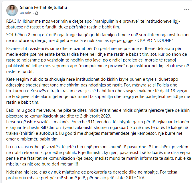 “Mënyra se si Policia dhe Prokuroria e Kosovës e trajtoi rastin e vrasjes së babit tim dhe vrasjes makabre të djalit 18-vjeçar në Podujevë ishte alarm tjetër që nuk mund ta shpërfillja dhe tregoj edhe padrejtësitë në lidhje me rastin e babit tim”, ka shkruar Sihana Bejtullahu.