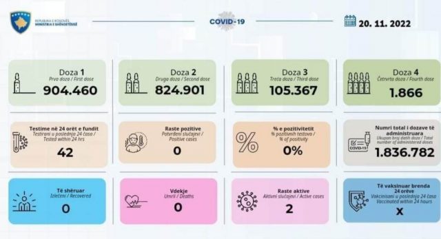 Aktualisht janë dy raste aktive me COVID-19 në Kosovë.