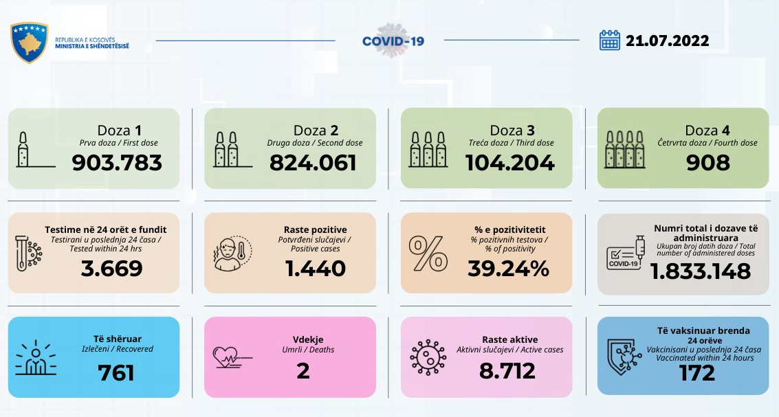 Gjatë 24 orëve të fundit kanë vdekur dy persona nga Covid-19, kurse janë shënuar 1.440 raste pozitive.