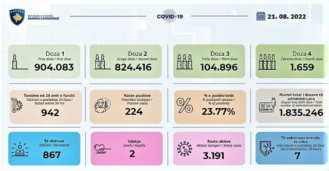 Ministria e Shëndetësisë njofton për dy vdekje brenda 24 orëve si pasojë e koronavirusit. Po ashtu bëhet e ditur edhe për 224 raste të reja pozitive.
