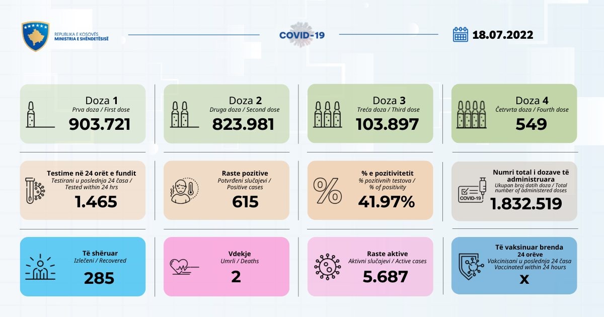 Ministria e Shëndetësisë ka njoftuar se nga 1465 testime të kryera në 24 orët e fundit, 615 prej tyre kanë rezultuar pozitivë me COVID-19.