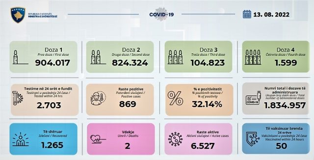 Ministria e Shëndetësisë ka njoftuar se nga 2703 testime të kryera, 869 kanë rezultuar pozitivë me COVID-19.