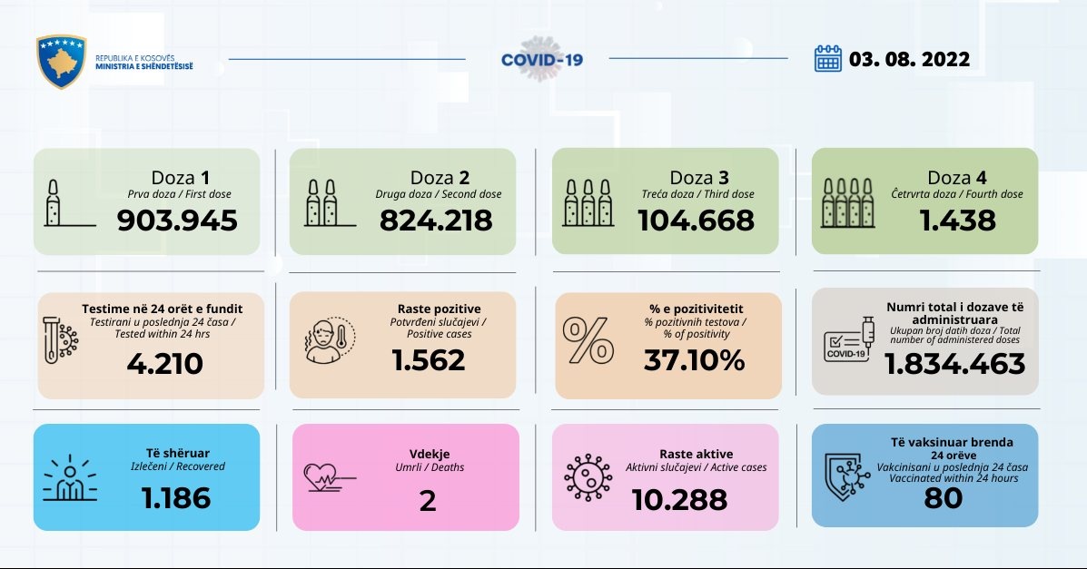 Ministria e Shëndetësisë bëri të ditur se gjatë 24 orëve të fundit në Kosovë janë regjistruar dy raste të vdekjes dhe 1,562 raste të reja me coronavirus.
