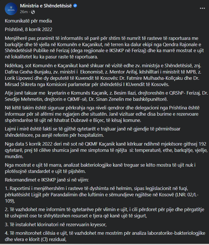 “Nga data 5 korrik 2022 deri më sot në QKMF Kaçanik kanë kërkuar ndihmë mjekësore githsej 192 qytetarë, prej të cilëve shumica janë me simptoma të njëjta si: temperaturë, ethe, barkqitje, vjellje, mundim.