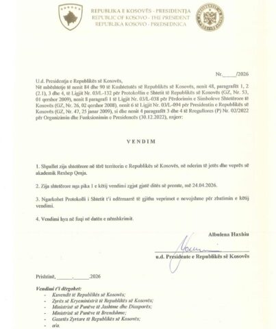 Kështu ka njoftuar ushtruesja e detyrës së presidentes, Albulena Haxhiu, transmeton Klankosova.tv.