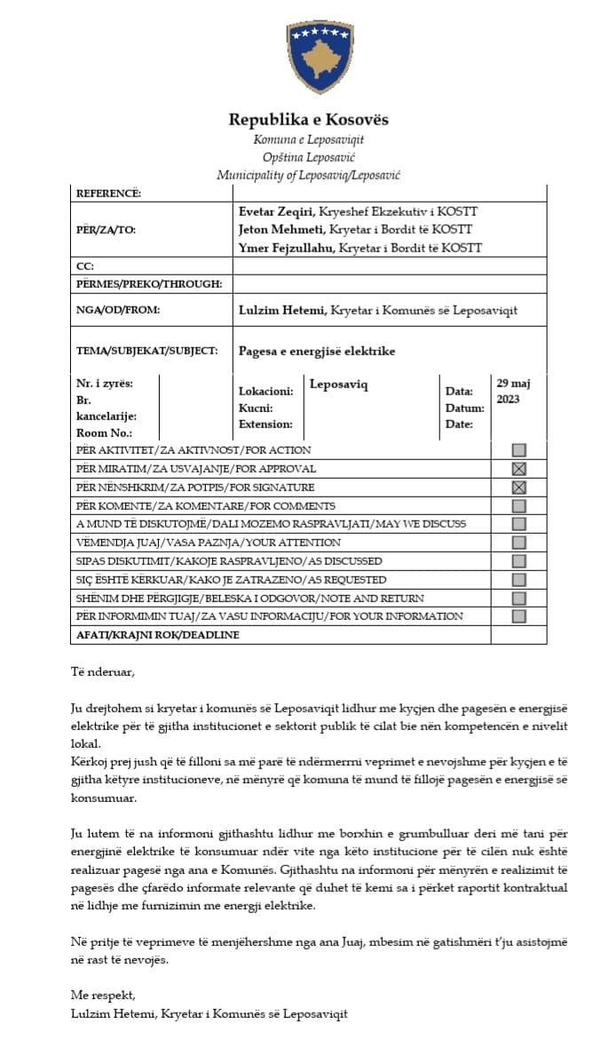 Kryetari i ri i Leposaviqit, Lulzim Hetemi, i ka dërguar letër KOSTT-it dhe ZRrE-së për të nisur pagesa e rregullt e energjisë elektrike në këtë komunë.