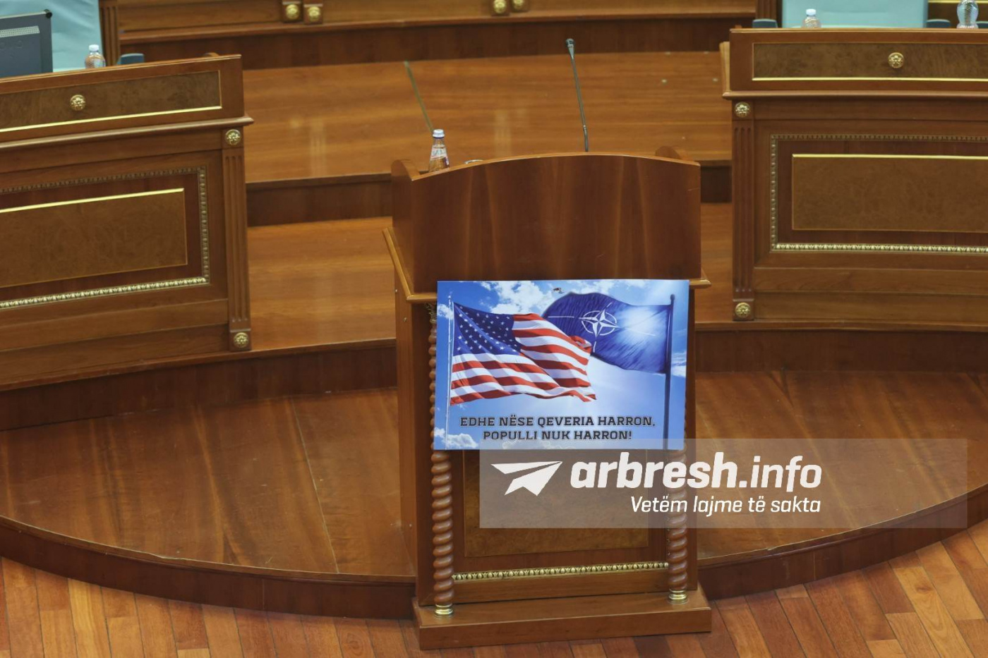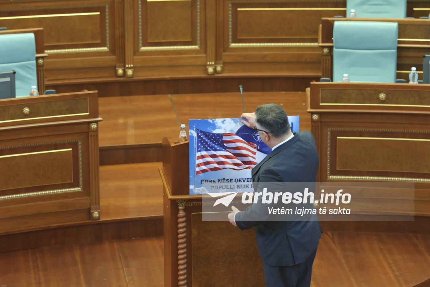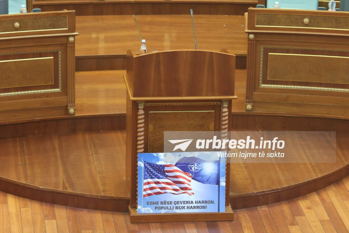 Shefi i Grupit Parlamentar të Aleancës për Ardhmërinë e Kosovës, Besnik Tahiri, ka vendosur një pankartë në foltoren e Kuvendit të Kosovës.