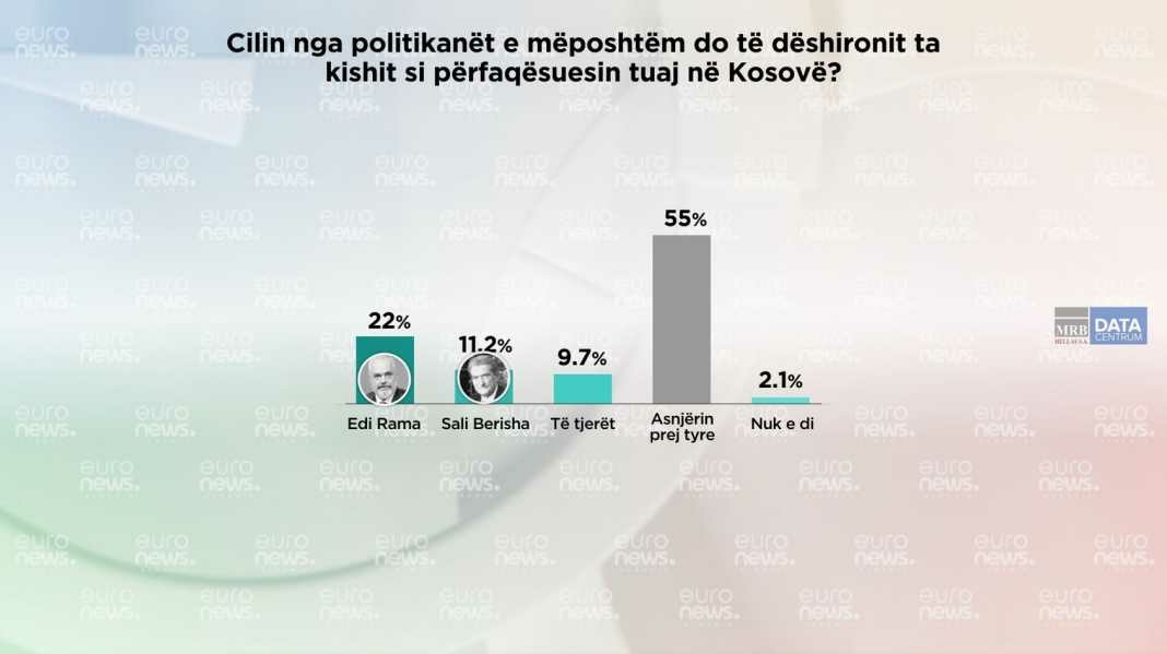 1065 qytetarë të pyetur në Kosovë se cilin nga përfaqësuesit poltik të Shqipërisë do të donin ta kishin përfaqësuesin e tyre në Kosovë, 22 % kanë zgjedhur Edi Ramën.