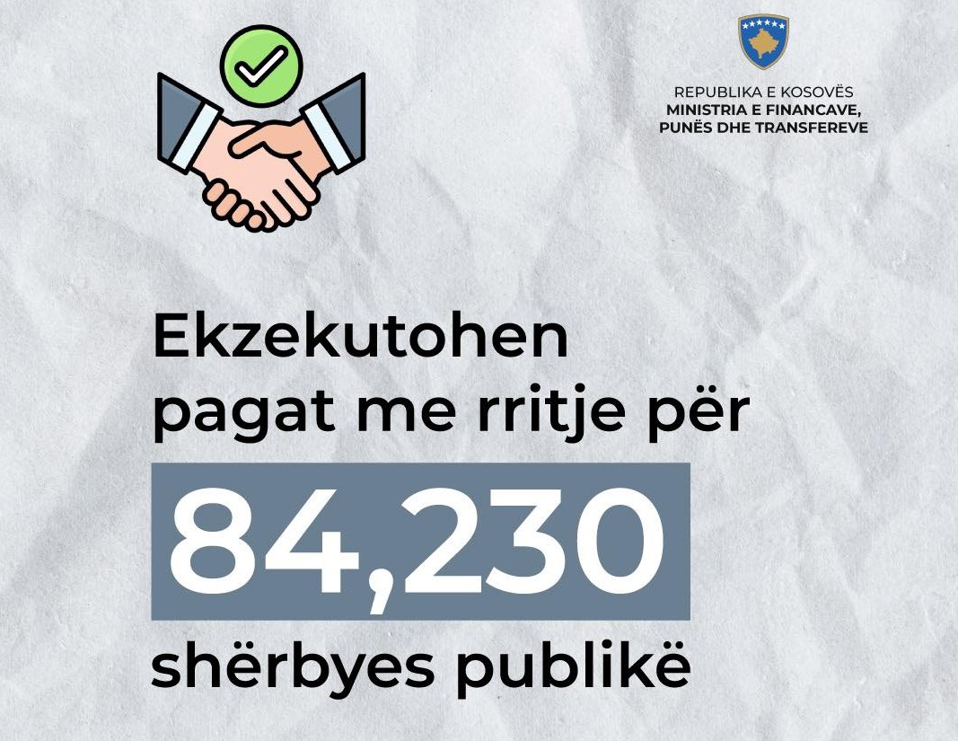 Ministria e Financave, Punës dhe Transfereve ka njoftuar se sot janë ekzekutuar pagat me rritje prej +55 euro për 84,230 shërbyes publikë nëpër organizatat buxhetore.