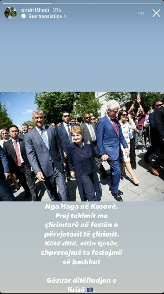 Endit Thaçi, djali i ish-presidentit Hashim Thaçi, ka shkruar për përvjetorin e Ditës së Çlirimit.