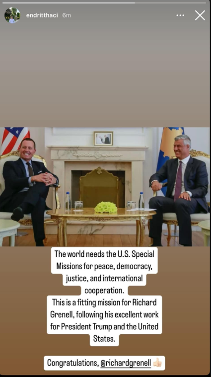 Në Instastory, Thaçi ka shpërndarë një fotografi të ish-presidentit me Grenellin teksa ka shkruar se bota ka nevojë për misionet speciale të SHBA-së