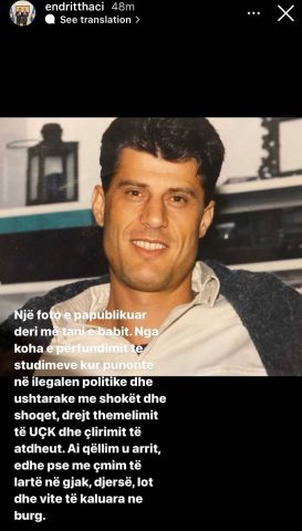 “Një foto e papublikuar deri më tani e babit. Nga koha e përfundimit të studimeve kur punonte në ilegalen politike dhe ushtarake me shokët dhe shoqet, drejt themelimit të UÇK dhe çlirimit të atdheut. Ai qëllim u arrit, edhe pse me çmim të lartë në gjak, djersë, lot dhe vite të kaluara në burg”, ka shkruar ai.