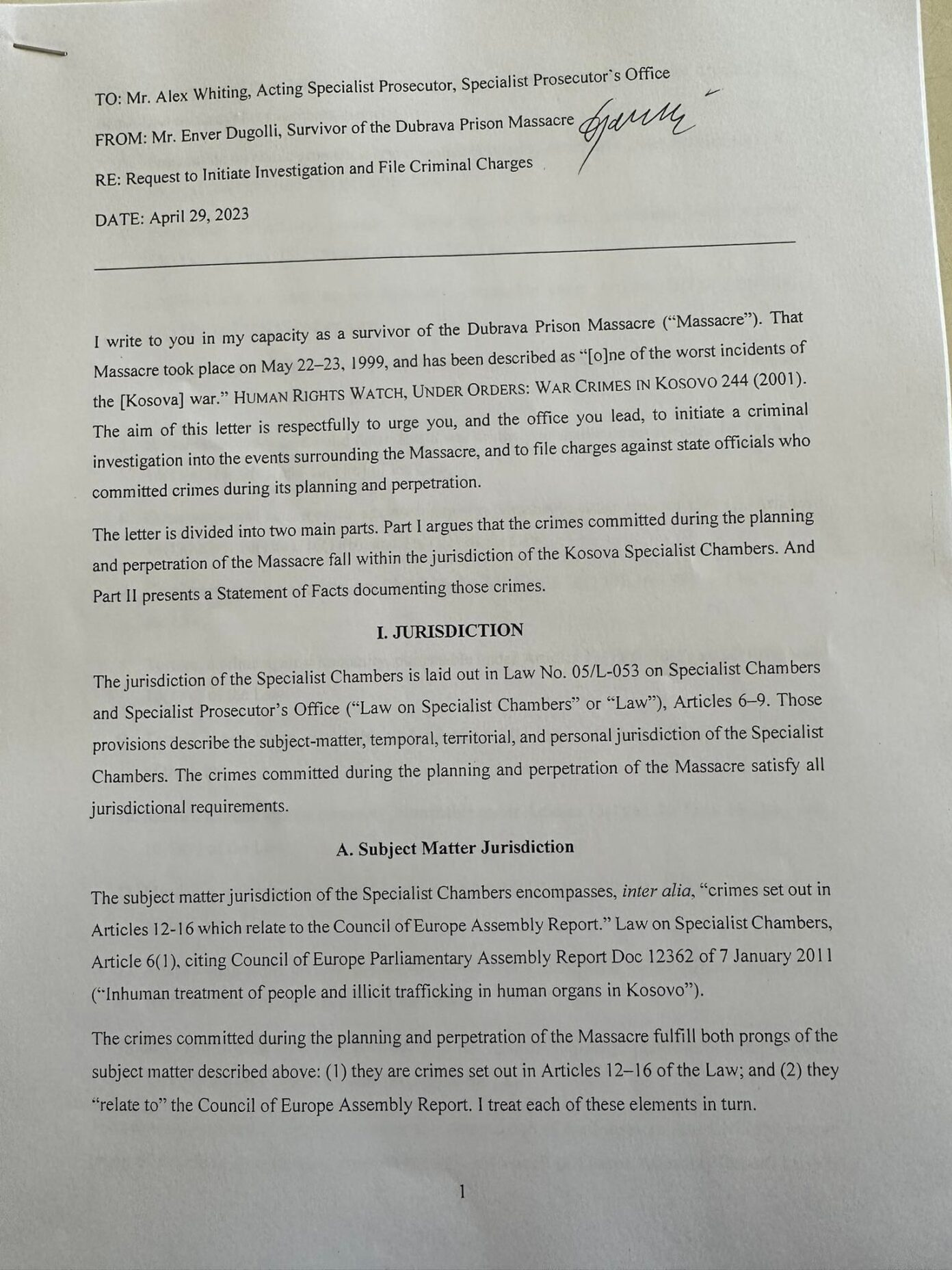 I mbijetuari i Masakrës së Dubravës, Enver Dugolli, ka dërguar dëshmi në Gjykatën Speciale dhe ka bërë kërkesë për hetime tek Prokurori Special i Dhomave të Specializuara, Alex Whiting.