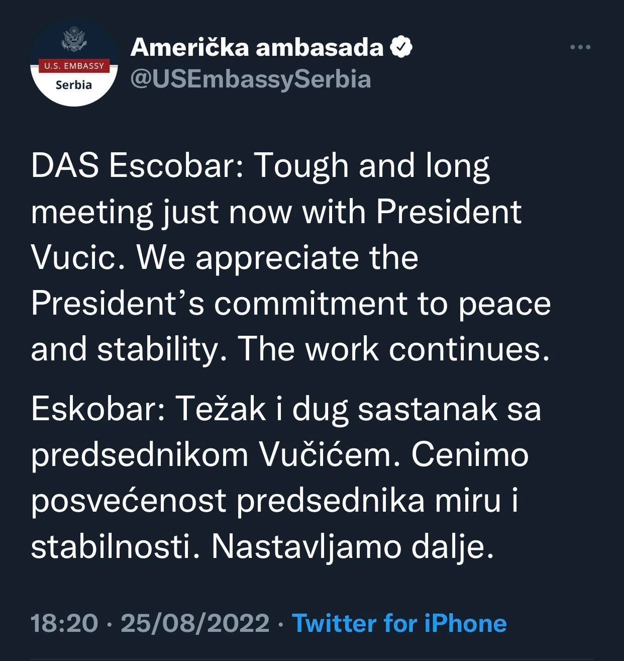 “Të vështirë dhe të gjatë” e cilësoi takimin edhe zoti Escobar. Në një postim të ambasadës amerikane në Beograd, emisari Escobar citohet të ketë thënë se e vlerëson “angazhimin e presidentit për paqen dhe qëndrueshmërinë. Do të vazhdojmë bisedimet”.